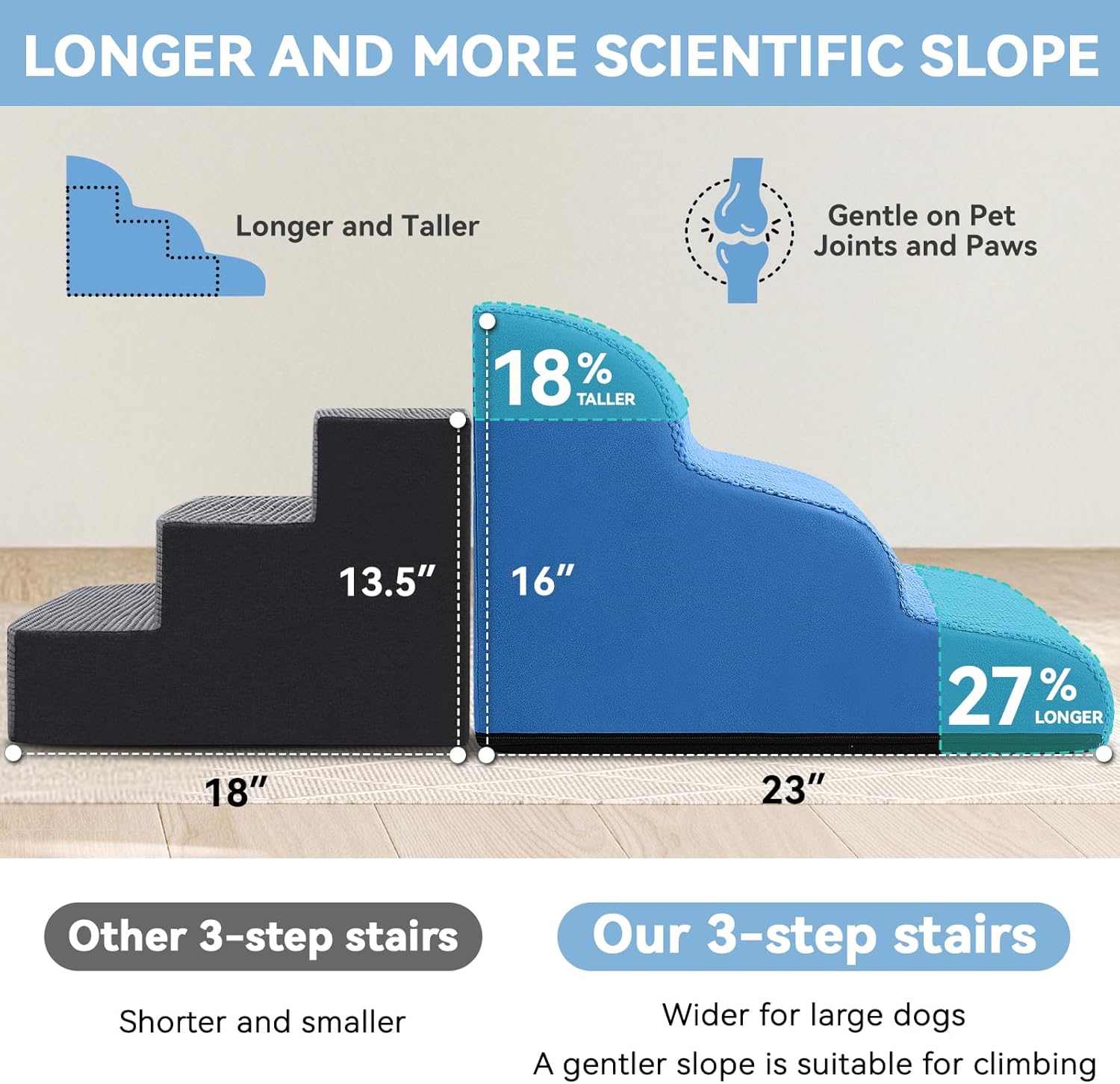 Dog Ramp and Stair for Bed 16" H-20 H,3-Step Cat Stair for Sofa and Chair,4-Step Dog Ramp for High Bed and Window,Durable Nonslip Fabric Cover for Indoor (Blue-16“H, Pet Friendly, 3)
