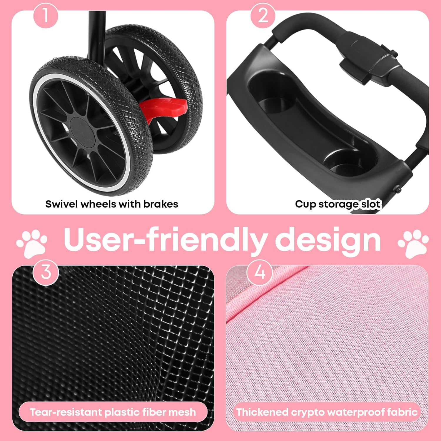 - [All-Terrain Safety & Control] The cat stroller equipped with 360Β° swivel front wheels for smooth maneuverability and dual rear brakes for instant stopping power. It glide seamlessly on sidewalks, grass, or uneven terrain, ensuring a safe ride