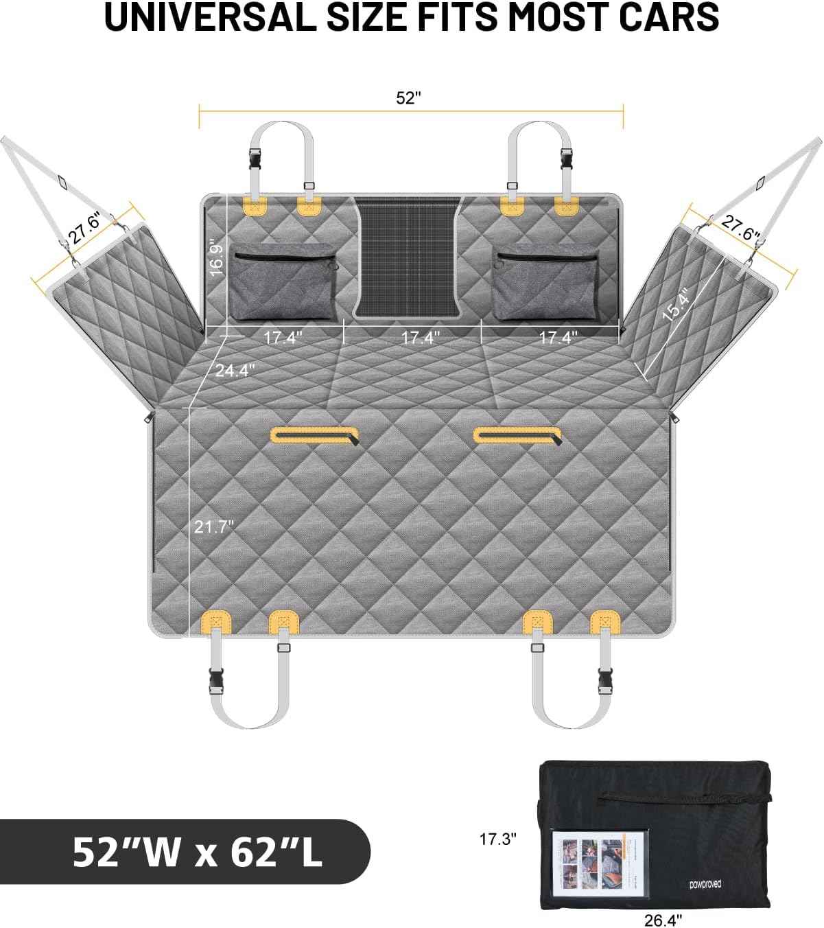 - Extended Activity Space: Our car hammock (52.3βW x 24.4βD) prevents footwell sliding, expands space by 40%, and ensures safety for movement and stretching to ease travel anxiety. Offers full rear-seat coverage, ideal for large breeds, older dogs, or multi-dog households.