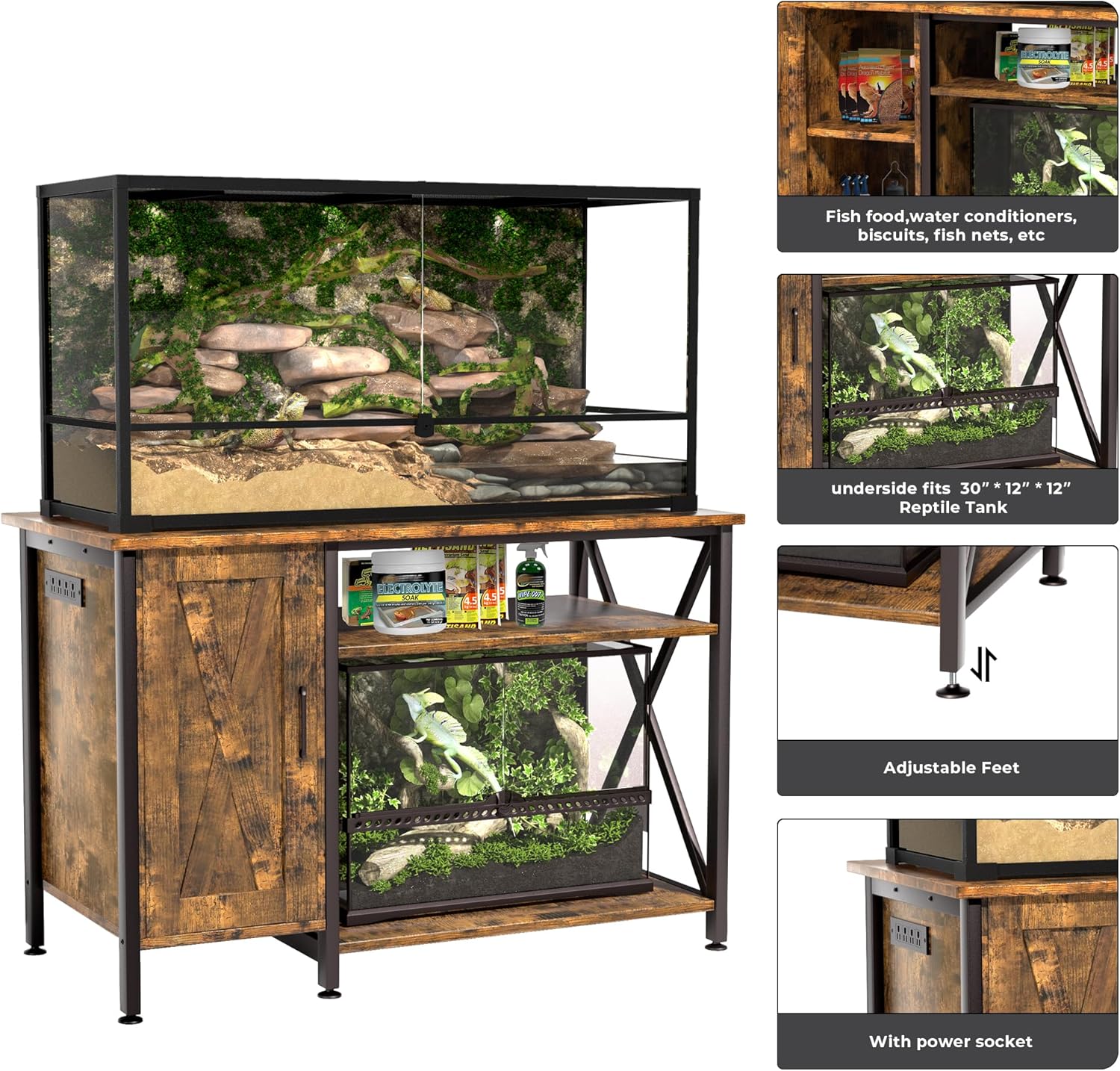 - Optimized Space Utilization - This terrarium stand offers a comprehensive solution for reptile owners. The left cabinet and upper shelf provide ample storage for reptile accessories, health supplies, habitat decor, and lighting equipment. The right-side 30" x 20" space accommodates a smaller reptile tank, creating a multi-tier habitat layout. Itβs a perfect match for a 120-gallon reptile tank stand, ensuring a more efficient and organized setup.