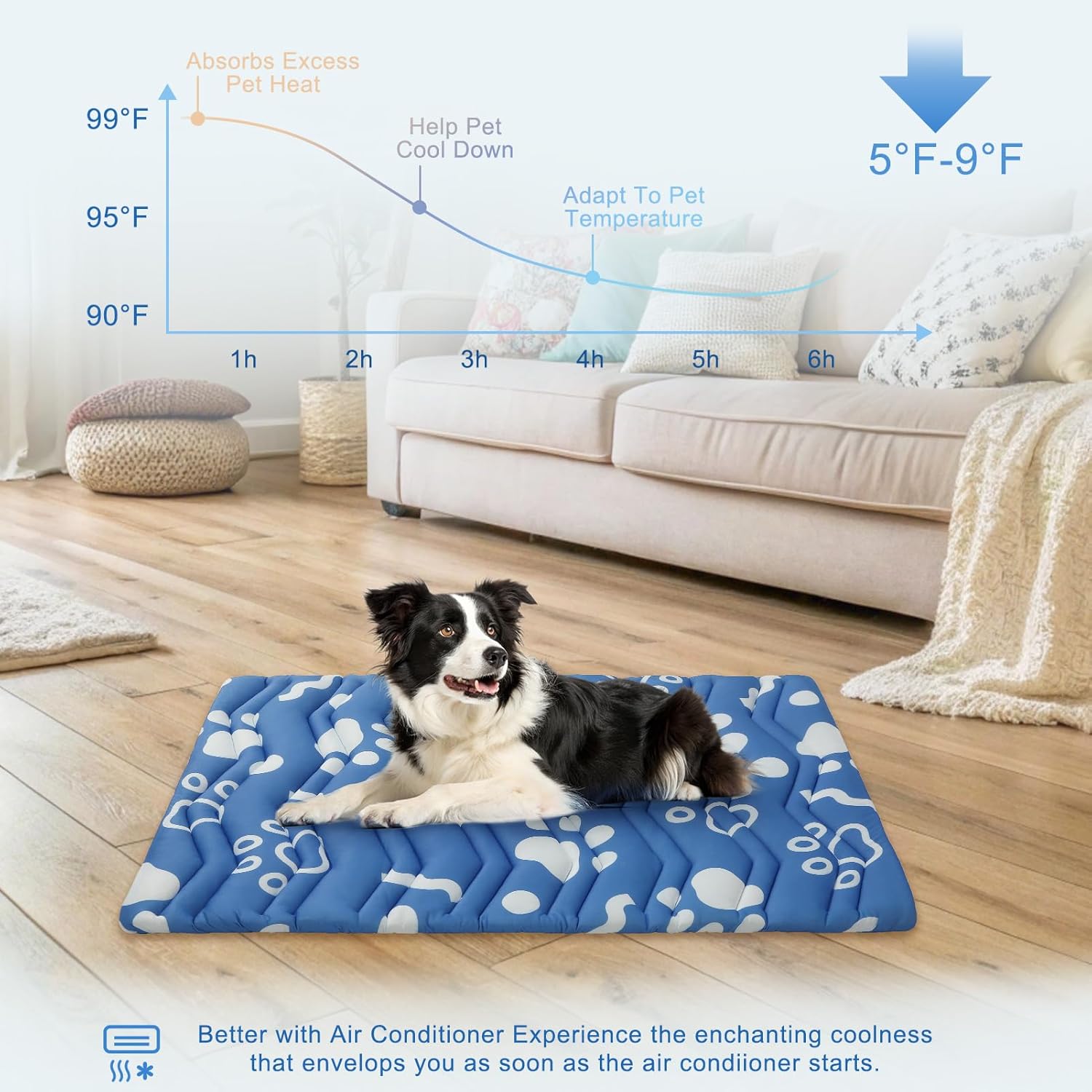 BEAUTYZOO Dog Cooling Mat- Upgraded Thicken Cooling Mat for Large Dogs Reversible(Cool & Warm) Pet Ice Cool Bed Washable & Portable, Summer Crate Pad for Big Dog Puppy Up to 100 lbs, Paw Blue 59X40IN