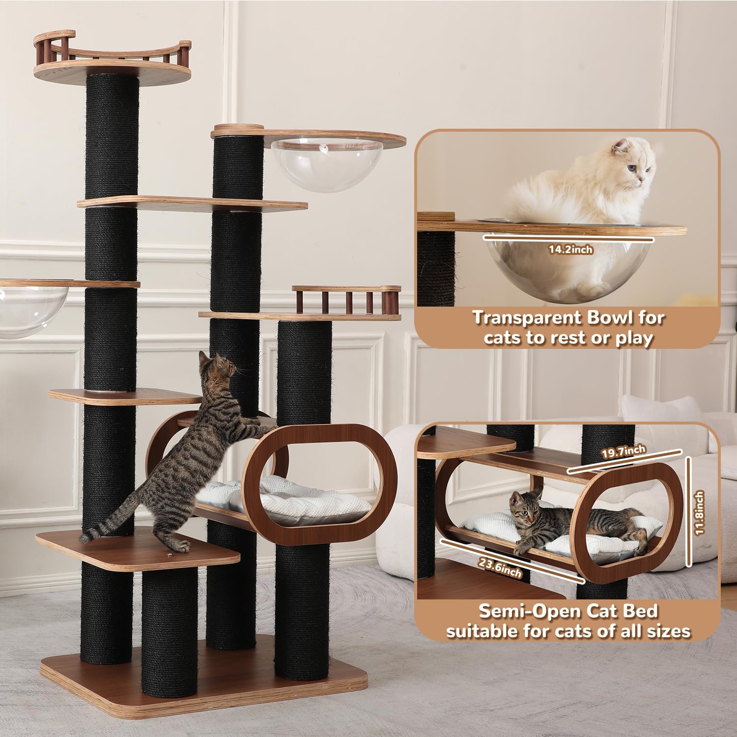 - All-In-One Cat Activity Center: this modern cat tower has a total of 1* large cat bed with non-slip cushion,2* clear bowls with 14.2 inch diameter,2* elevated viewing platforms with fences (measuring 17.7 inch and 23.6*19.7 inch in diameter),3* wide perching platforms,multiple 6 inch diameter cat scratching posts,and a unique decorative cat tree for big cats that meets all the needs of cats in daily life.