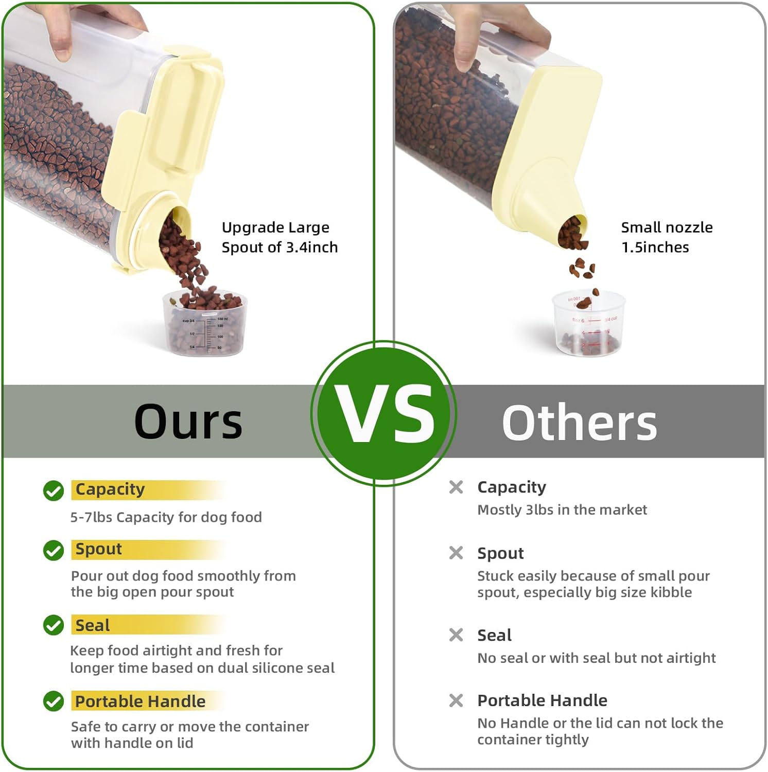 5-7Lbs Cat Dog Storage Container, Portable Pet Food Containers with Upgraded Large Spout and Cup, Small Animal Kibble Dispenser for Bird Seed, Oatmeal, Rice, Flour (1, Cream yellow, 5L)