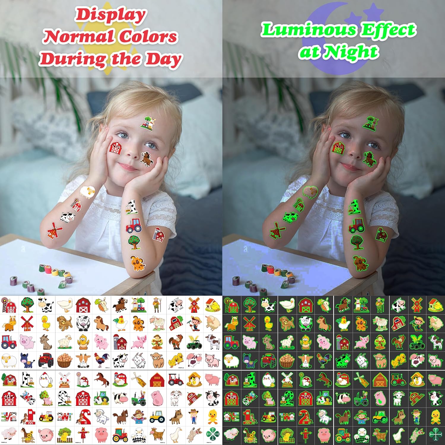 - ๐TATTOOS FOR FARM BARNYARD ANIMAL THEMED DECORATION: FARM GLOW IN THE DARK DIE-CUT TATTOOS for people who love farm, farmhouse , Animal. Featuring 8 sheets with 96 pcs of lovely, fun and colorful design: Cow, pig, horse, tractor... Each sheet measures 6.3 * 4.7 inches. You can temporarily tattoo them on your body or objects such as phones, bottles, laptopโฆ