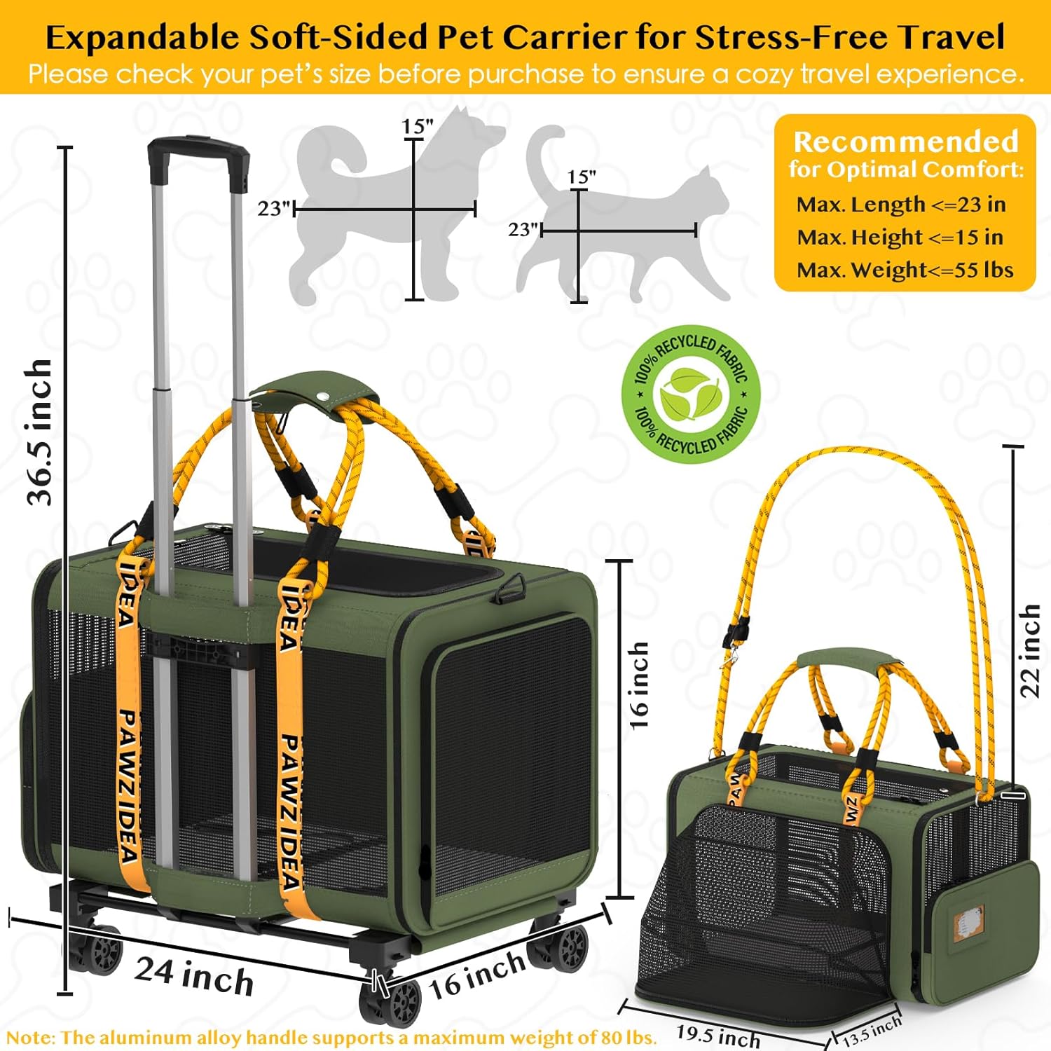 - Expandable for Spacious Comfort โZip open the front to double the space, comfortably fits 2 large cats or a small/medium dog on long trips. Soft-sided pet carrier (24x16x16in) ensures your pet can stretch and relax. Rolling design makes it perfect for outdoor travel, airport, or daily vet visits.