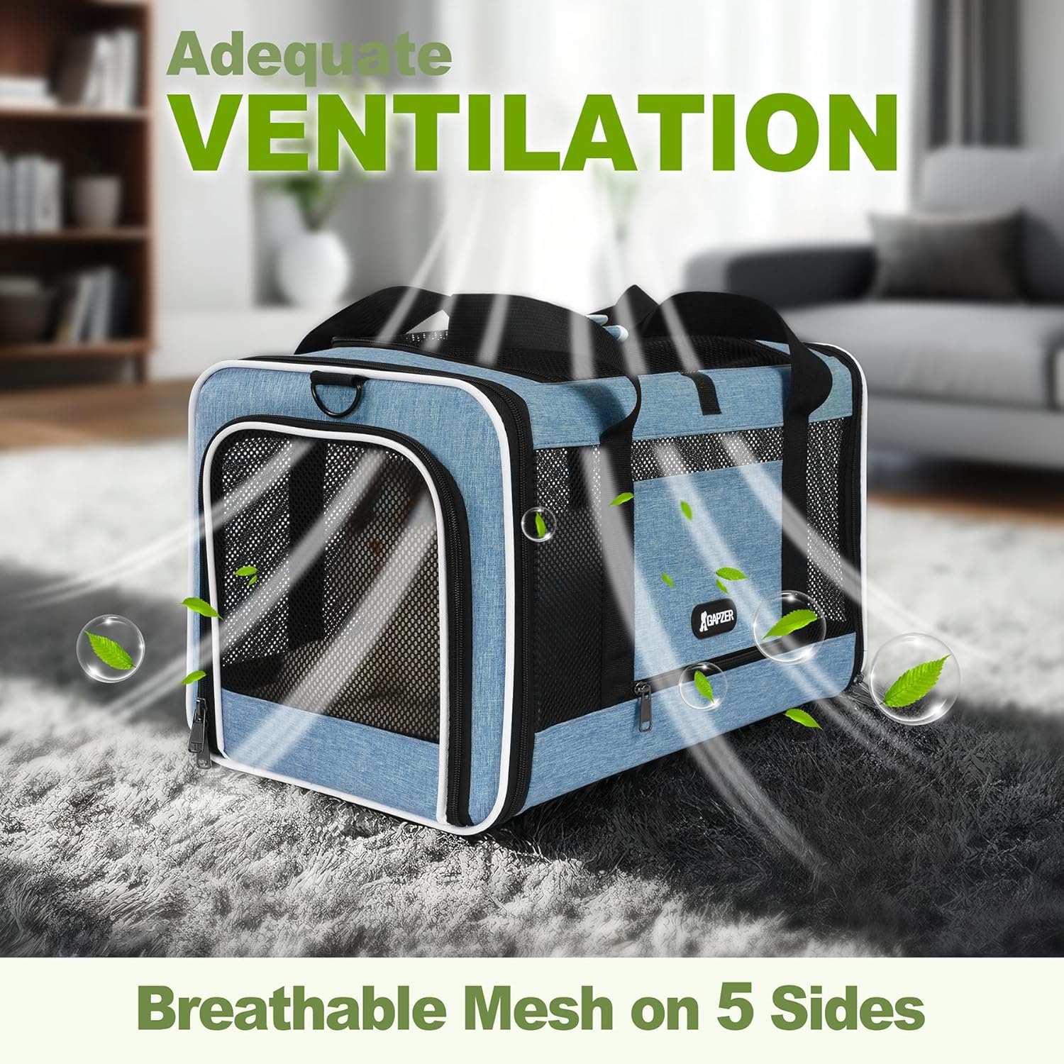 - 360Β° Ventilation & Dual-Entry - Four-sided mesh ensure constant airflow during transport, while the wide top opening and side door facilitate stress-free transfers and quick check-ins for rabbits and puppies