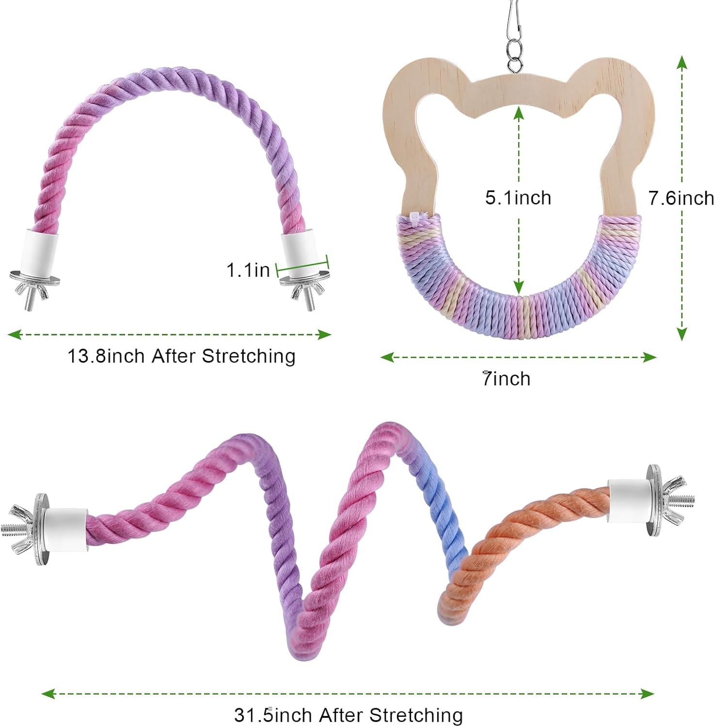 - OPTIMISED SIZE: Includes a 13.8 inch and a 31.5 inch bird rope perch that flexes. There is also a wooden bird swing. Fits any cage shape, creates multi-level play area for climbing, resting and exploring, reduces territorial conflicts between birds