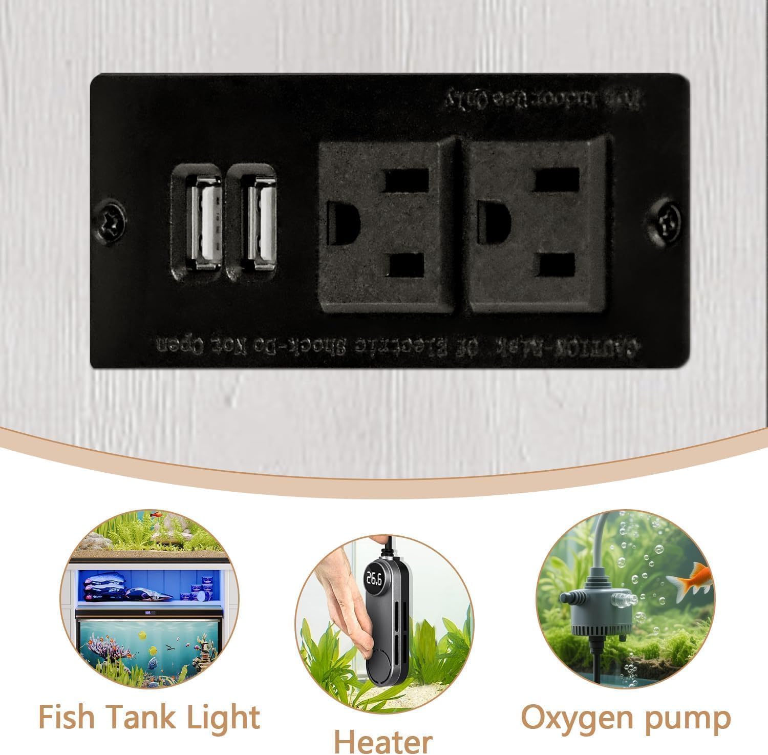 - Power Outlet and USB Charging Port: This aquarium stand has built-in 2 power outlets and 2 USB ports, which can be used to power and charge your devices. This keeps wires organized and simplifies aquarium management
