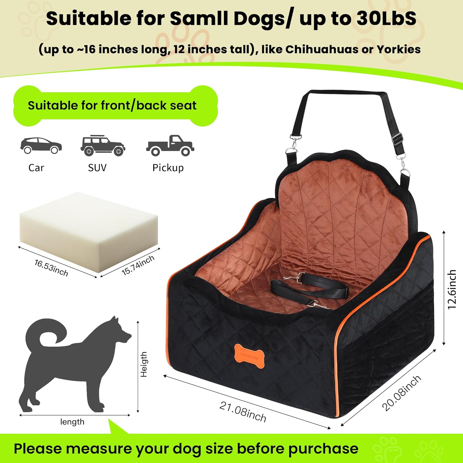 Dog Car Seat for Small Dogs Under 30lbs, Detachable Washable Pet Booster Seat with Safety Belt & Storage Pockets, Travel Car Bed, Black/Brown