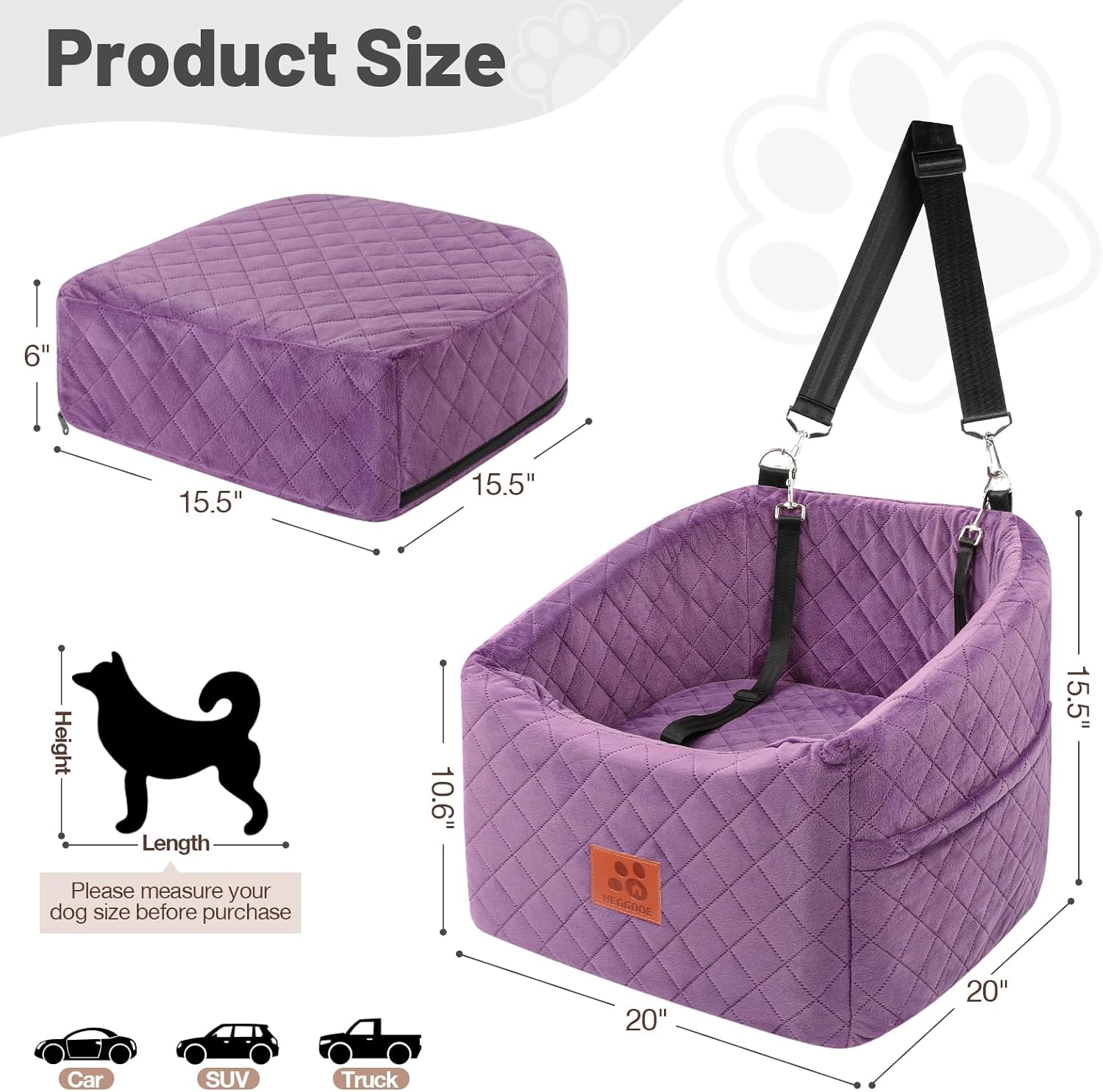 Dog Car Seat for Small Medium Dogs, Memory Foam Pet Booster Seat for Dogs up to 35 lbs, Elevated Dog Carseat, Travel Safety Bed with Washable Removable Cover and Storage Pockets (Purple)