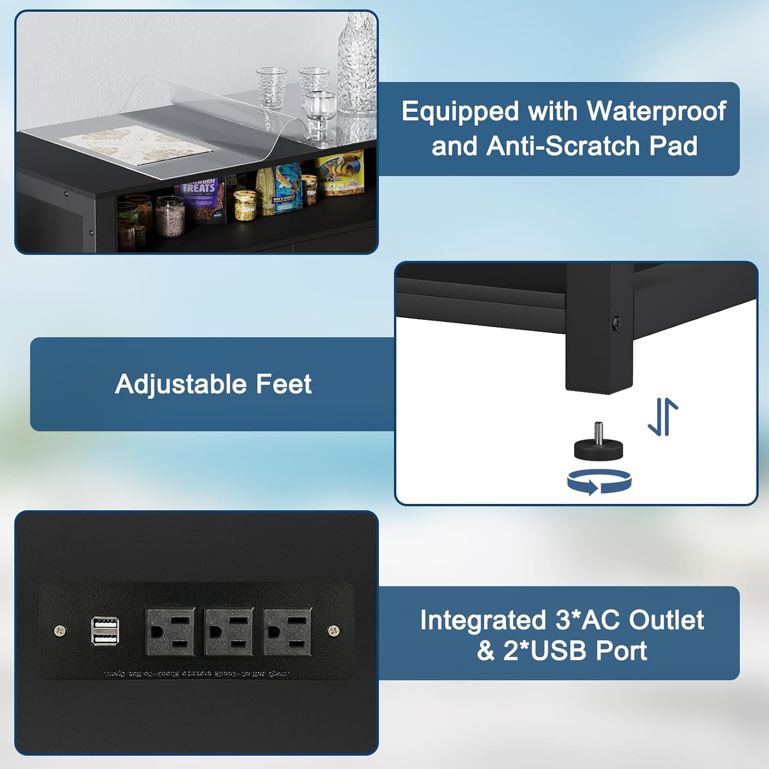 - Power Outlet โ Never worry about tangled cords again! This advanced aquarium stand comes equipped with a built-in power strip featuring 3 AC outlets and 2 USB ports, making it effortless to power heaters, filters, pumps, and LED lightsโall while keeping wires neatly organized.