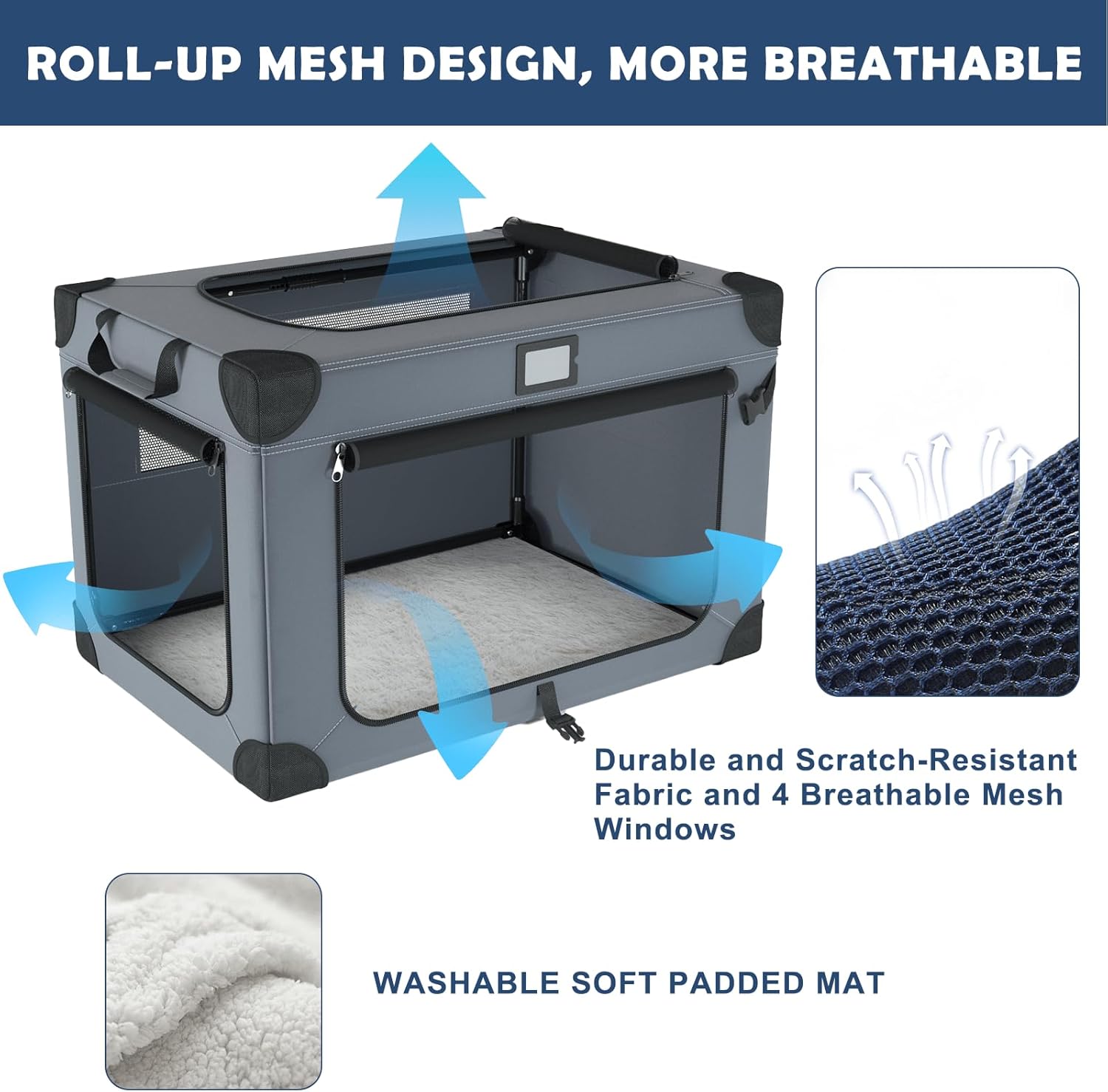 - 【Comfortable and Breathable】Canvas dog crate is equipped with four mesh windows for comfortable ventilation and easy to check on your pet's condition. In addition, the zipper design allows you to roll up the mesh wall, making it easy for your dog to get in and out freely