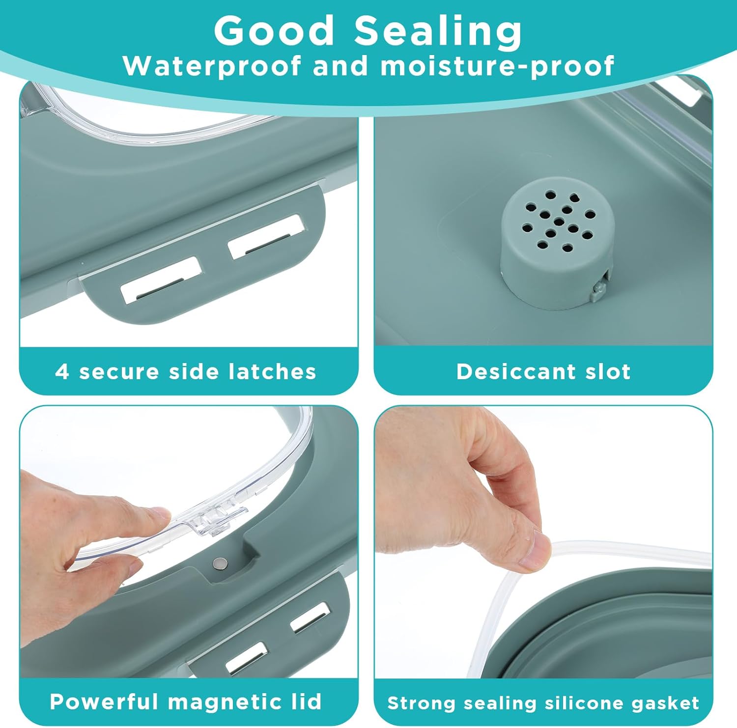 - Package Include: the foldable cat litter storage container is waterproof and moisture resistant, featuring a clear, magnetic seal lid, 4 side lock lids, and silicone seal rings; The lid also includes 2 silicone seal rings and a desiccant slot for enhanced moisture prevention
