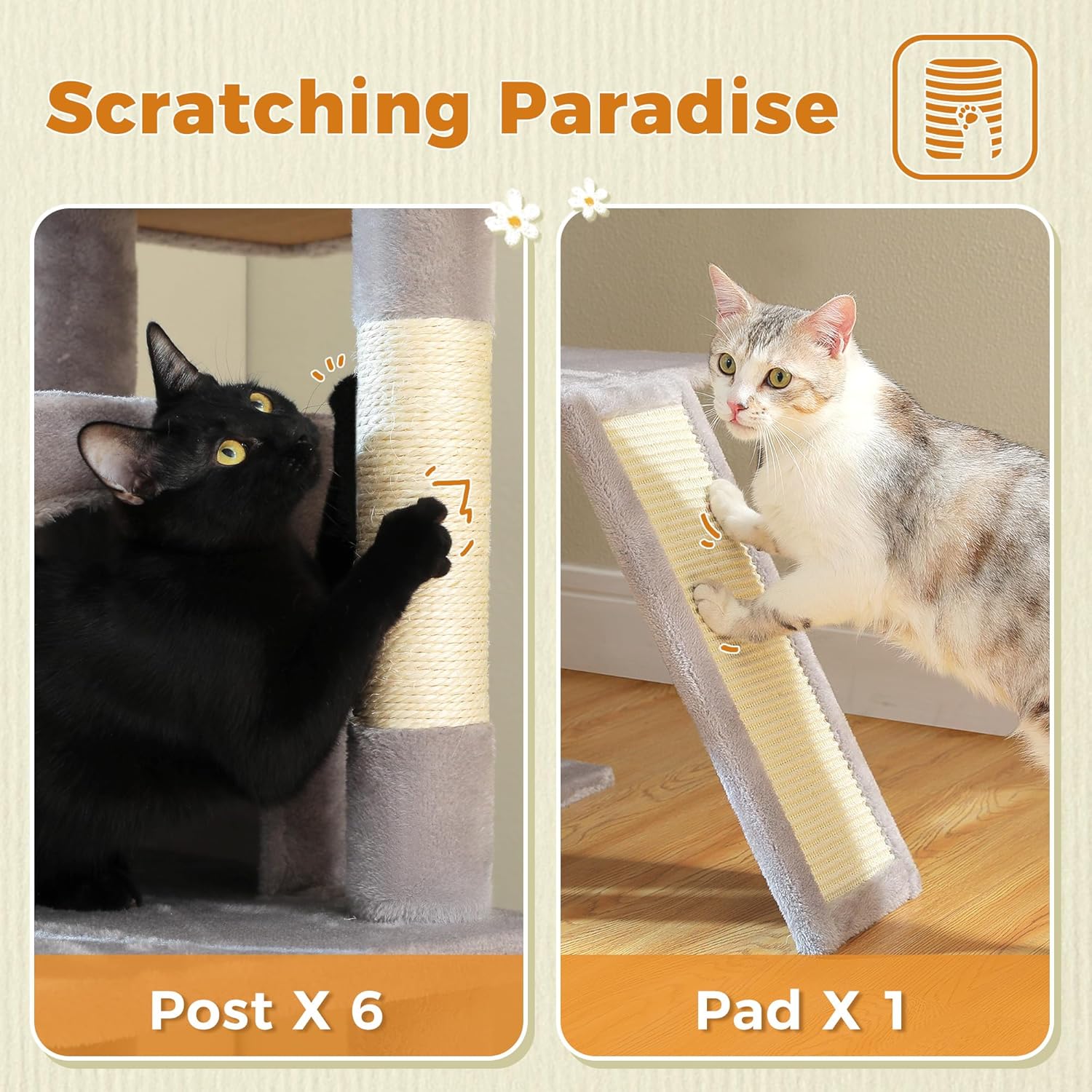 - Ultimate Scratching & Play Center: Designed for large adult cats, this Big cat tree features 6 durable sisal-covered scratching posts, a 2-in-1 scratch pad runway, and 2 dangling toys with 1 bonus replacement ballโperfect for active play and claw care. A cozy round basket hammock and spacious double-door condo offer ideal spots for lounging and napping.