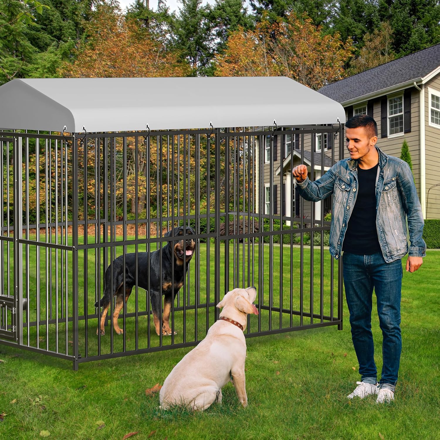 - HEAVY-DUTY CONSTRUCTION FOR MAXIMUM SECURITY: Our outdoor dog kennel is designed with a robust frame featuring upgraded iron guardrails that resist bending, rust, and fading over time. The rust-resistant, fade-proof frame ensures long-term stability, offering your pet a secure and sturdy for years of safe play and relaxation.