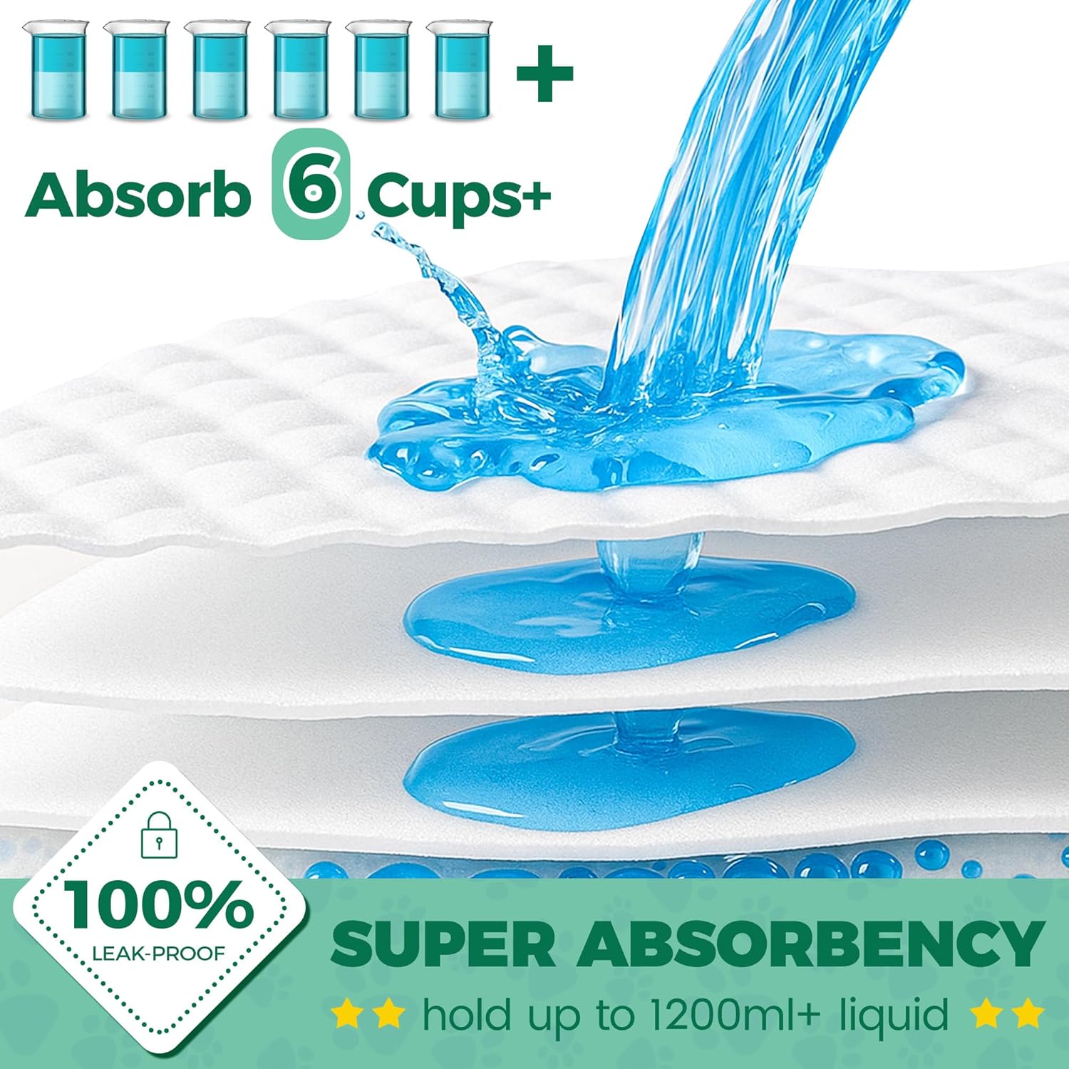 - SUPER ABSORBENT DOG PEE PADS: Extra large pee pads for dogs with super absorbent polymer(SAP) technology are more absorbent than previous dog potty pads, the water absorption capacity of each xlarge puppy pad above 1200+ milliliters (hold up to 6 cups or more of liquid)β keeps paws dry and floors stain-free.