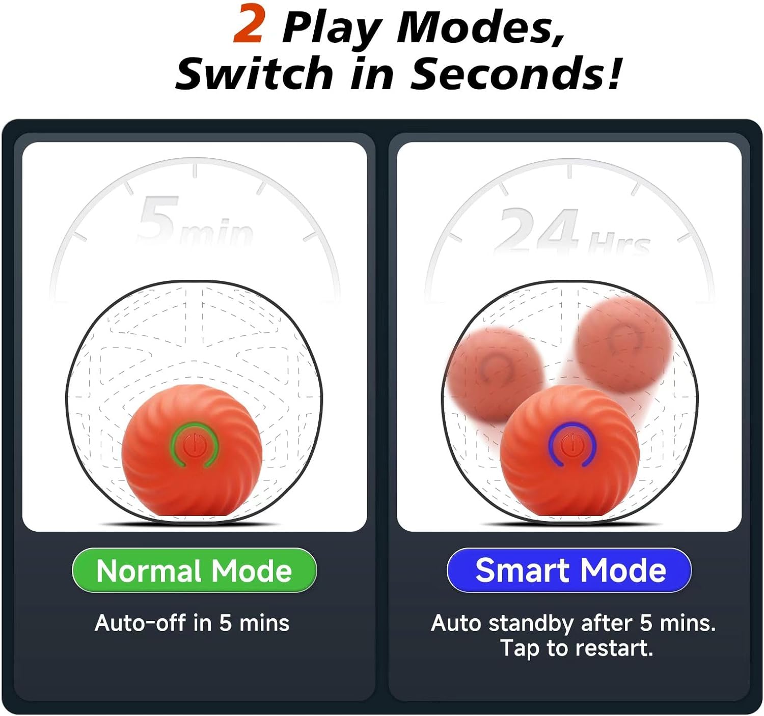- 【2 Selectable Modes】:Switch between Normal Mode (Green Light) and Smart 24-Hour Mode (Blue Light) with a long press. In Normal Mode, the ball moves for 5 minutes and stops automatically. In Smart Mode, it sleeps after 5 minutes but reactivates when touched by your dog—perfect for interactive all-day play.