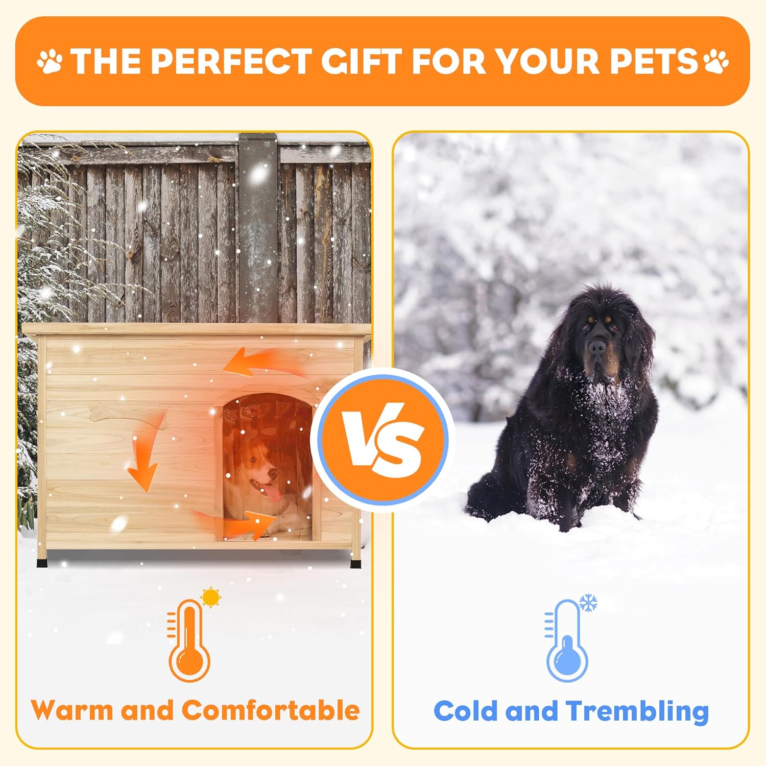 - [Specially Designed for Outdoor Use] The sloping asphalt roof is expertly engineered to prevent rainwater from pooling, ensuring that your pet's living space remains dry and comfortable. The floor is 2.4’’ above the ground, and there is a removable PVC curtain and adaptable floor pads for uneven ground. This design enables the dog house to withstand harsh weather conditions, preventing water from seeping in and materials from getting damp
