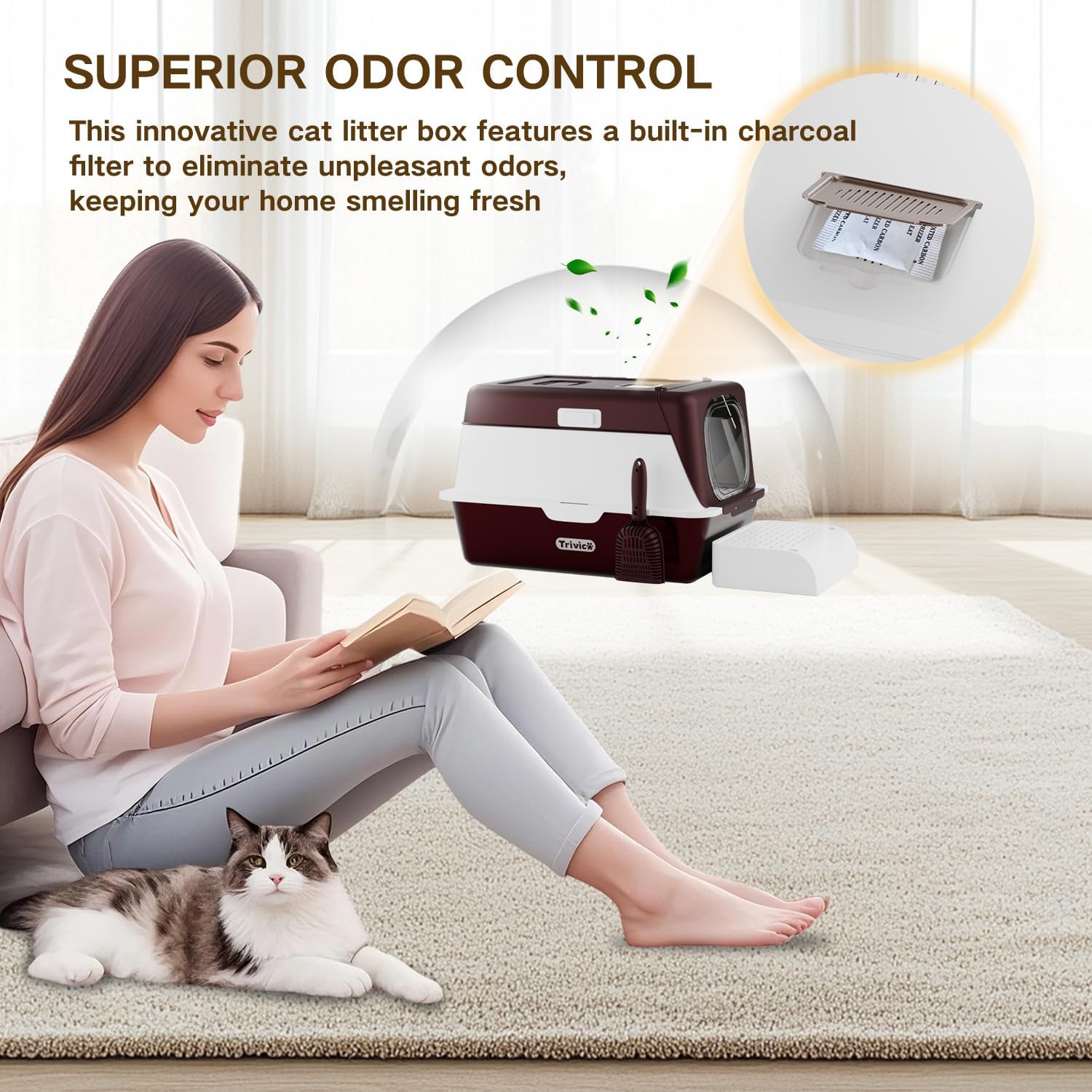 - Fully enclosed odor-proof design – Features a magnetic door and high-sided barrier to completely seal in odors, maintain fresh air, and prevent litter scatter.