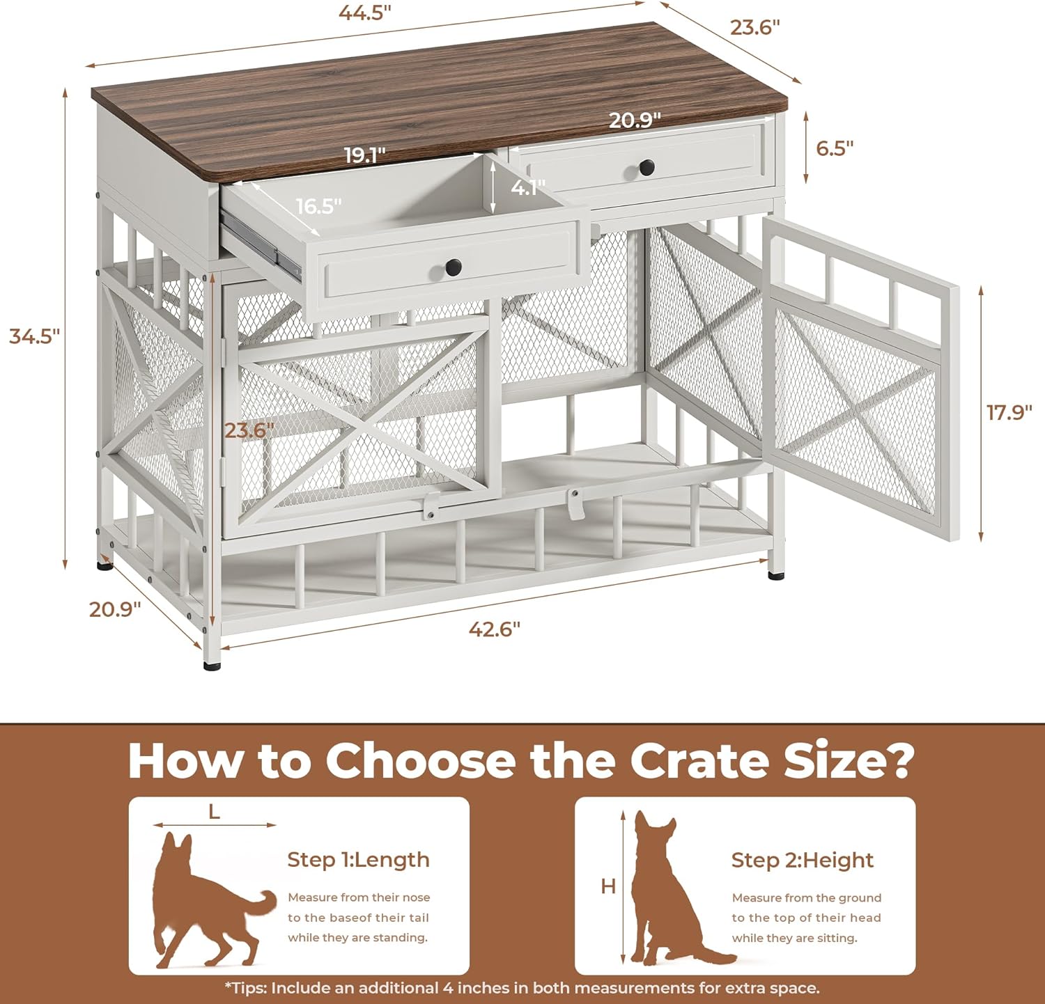 IRONCK 44 inch Large Dog Crate Furniture, Wooden Dog Kennel with Storage Drawers for Medium/Large Dogs, Decorative Dogs Kennel Indoor, White and Walnut