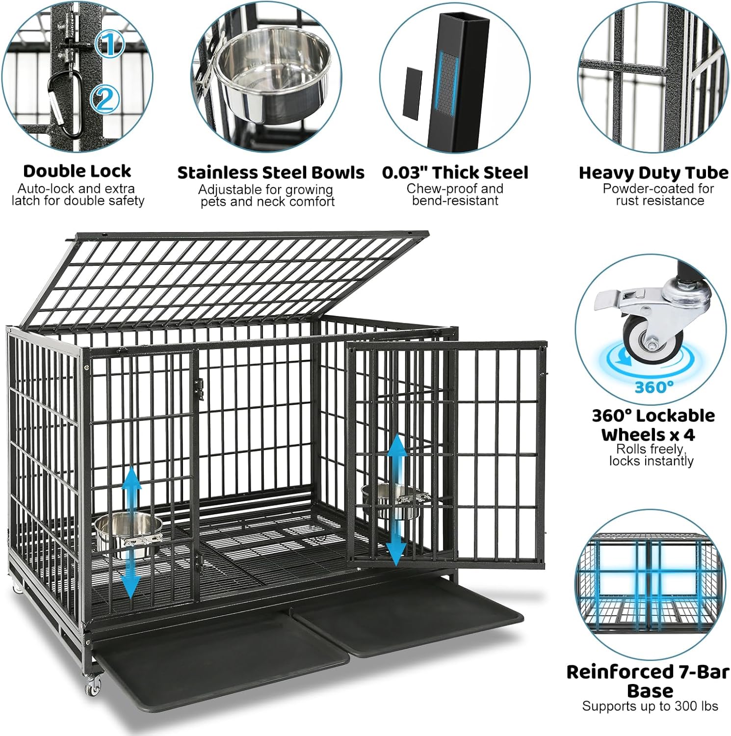 48 Inch Heavy Duty Dog Crate, Indestructible Escape Proof Big Cage for High Anxiety Large Dogs, Stackable & Collapsible XL Dog Kennel Indoor with Wheels,Dual Trays,Adjustable Bowl,Top Access
