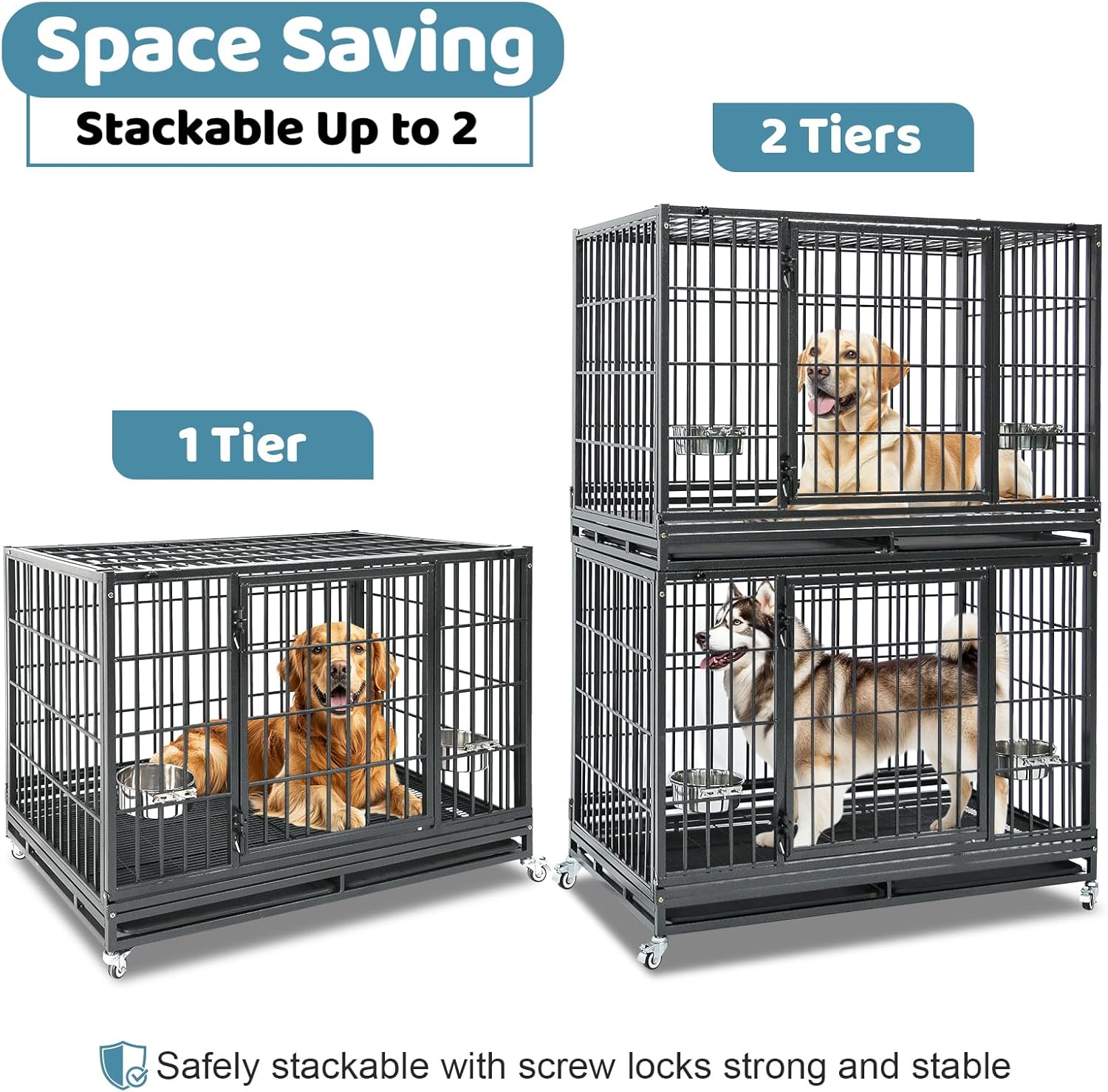 - Stackable to Save Space: The 48 inch dog crate stacks up to 2 tiers with secure screw-locksโideal for breeders, groomers, boarding facilities, and multi-dog homes