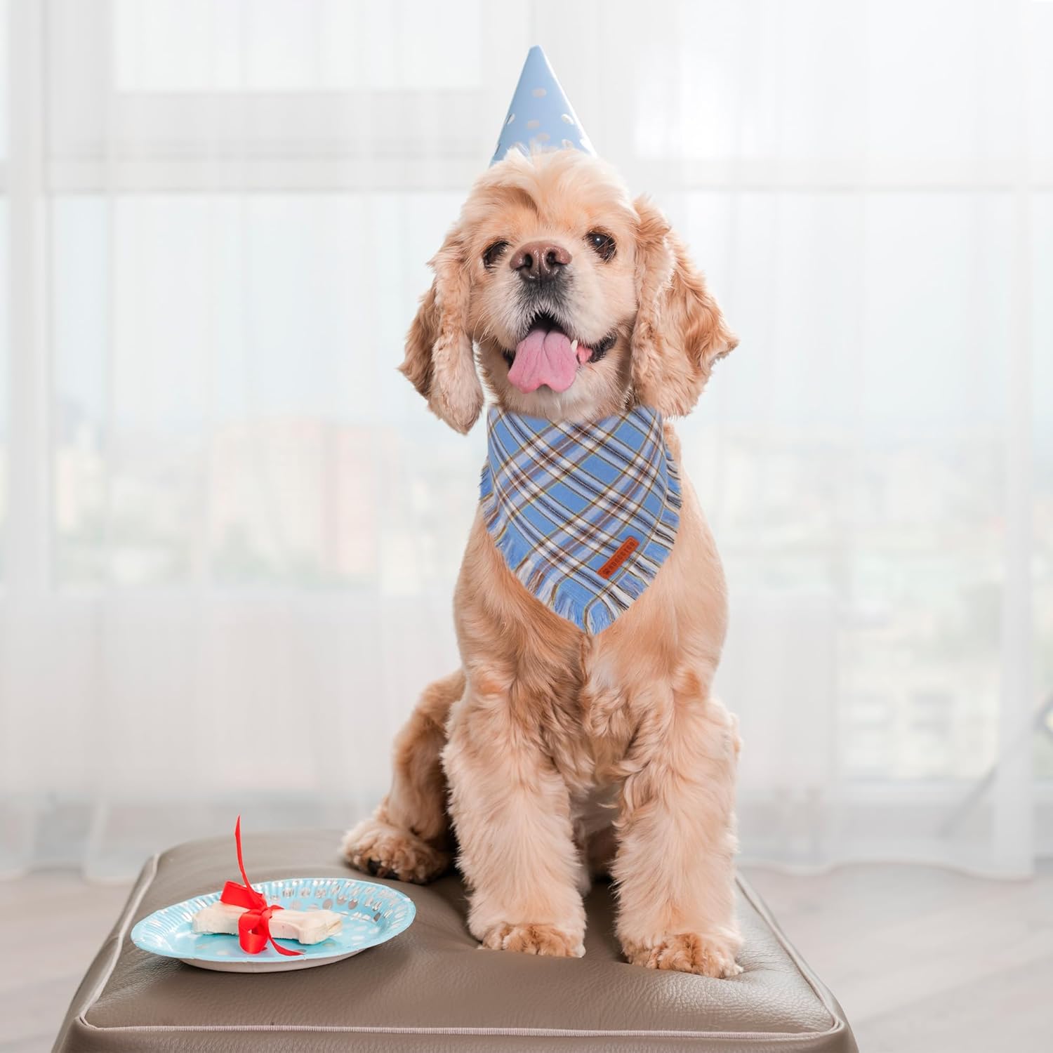 - Blue Dog Bandanas: Two different blue plaid patterns with stylish tasseled edges, Perfect for boy dogs, they give your pup a dapper and trendy look, ideal for daily walks, outdoor adventures, park hangouts, or gatherings.